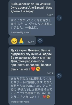 上記写真(物資提供を玄関口へ) 上記はお礼のメール Viber より