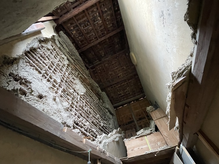 崩落した土蔵の壁が板壁との間に溜まり、板壁が膨らんでいる状態です。板壁の膨らみは、時間の経過と共に、徐々にせり出してきています。