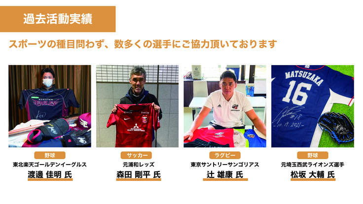 具体的な活動として、2022年4月現在までに4名のプロスポーツ選手から不要になったグッズをいただき、チャリティーオークションを開催いたしました。