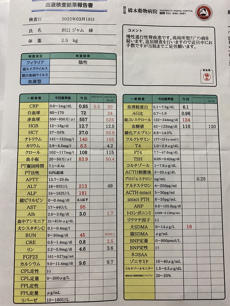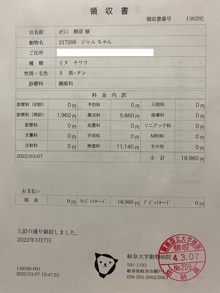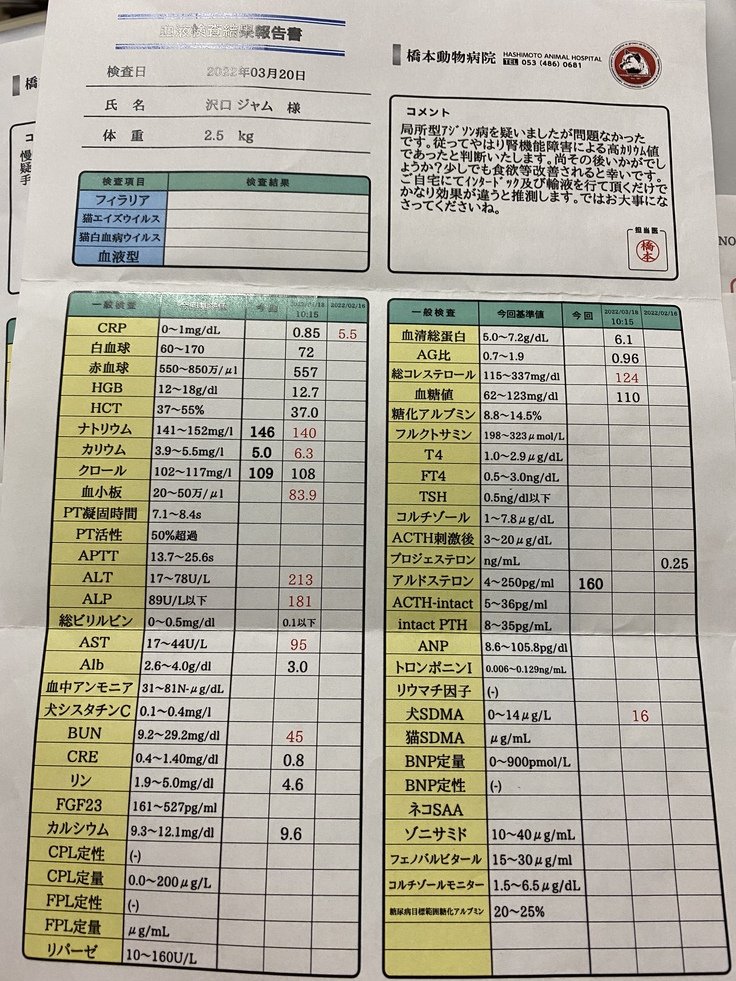 ジャムは腎臓がんを患っています。先生に、腫瘍が大きすぎるしいろんな血管や臓器を巻き込んでしまっているため、手術は難しい。手術したとしても余命はほとんど変わらないと言われました。できる治療は放射線治療、抗がん剤、今までやっていた炎症を抑える薬を飲む。治療はとても限られてしまうそうです。放射線治療は苦しむイメージがあるしやるか迷ったのですが、いろいろ検索していると1年も生きるのは難しいと言われていた子が3年生きたというのを見つけ、やってみようと思いました。前回のクラウドファンディングで集まったお金で3回の放射線治療を終え、今は抗がん剤治療を開始しました。それによって、先生が思っていたよりも腫瘍が小さくなったみたいです。それに加え、最近は毎日朝と夜に5種類の薬を飲んでいます。また、朝1回、夜1回、皮下点滴を家で行っており、2日に1回注射も行っています。そのおかげで、腎臓の数値は良くなっているのですが、これからもまだまだ続けなければいけないみたいです。岐阜大にも月一くらいの頻度で検査をしに行っており、交通費、治療費がかなりかかっていて家の貯金が底をつきそうになっています。救いたいけど、お金が無いという状況です。金銭面で苦しくなっているので、みなさんの力を借りたいと思いました。