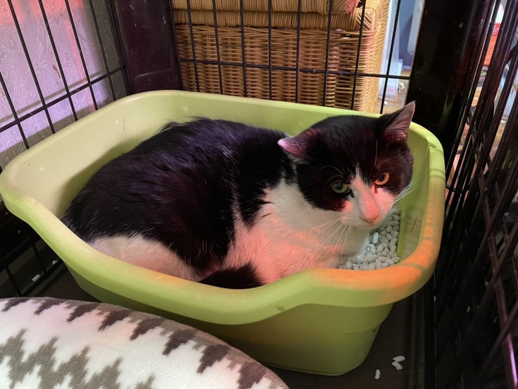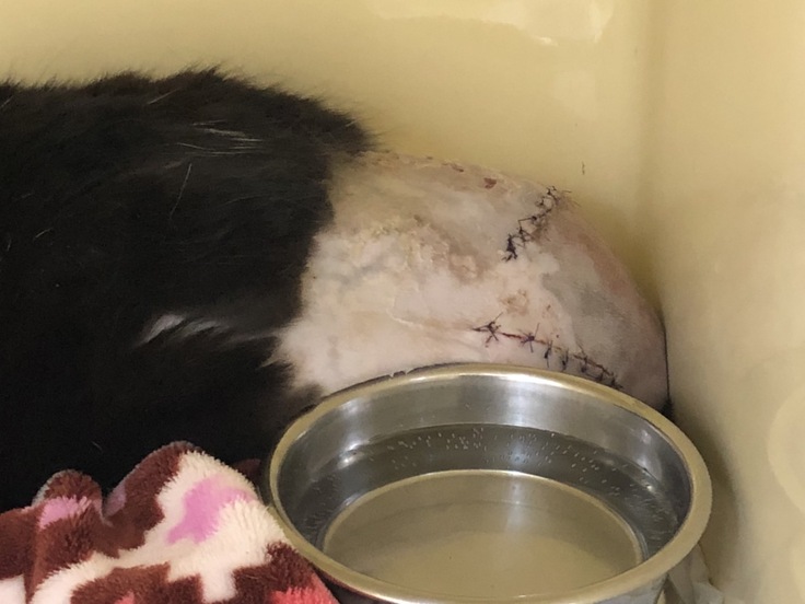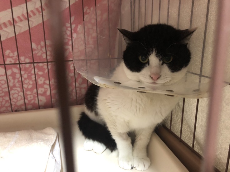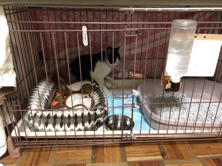 4/2に退院して当施設に戻りました。骨がずれてしまうので、1ヶ月は上下運動など行わず、安静にする必要があります。うんちがちゃんと出ているか確認をすることが重要で、うんちが出ていないと吐き戻しが起こり、再手術が必要になると言われました。交代でボランティアがお世話を行なっています。食欲旺盛とまではいきませんが、ボランティアが工夫して給仕し、目もしっかりしていて、ニャーニャー泣いたりしています。骨折以外は健康に問題もありませんとのことで安心しています。
