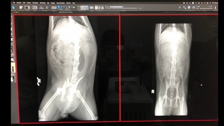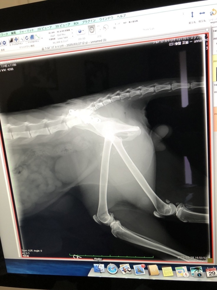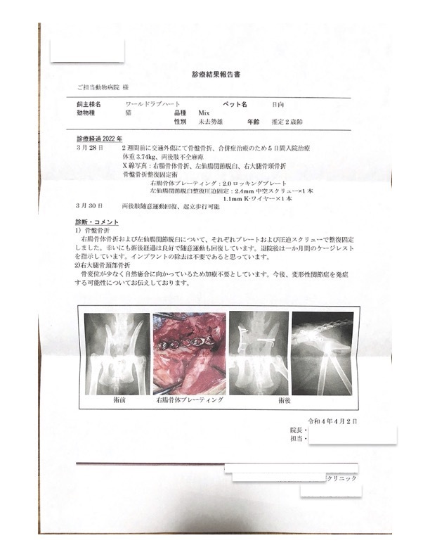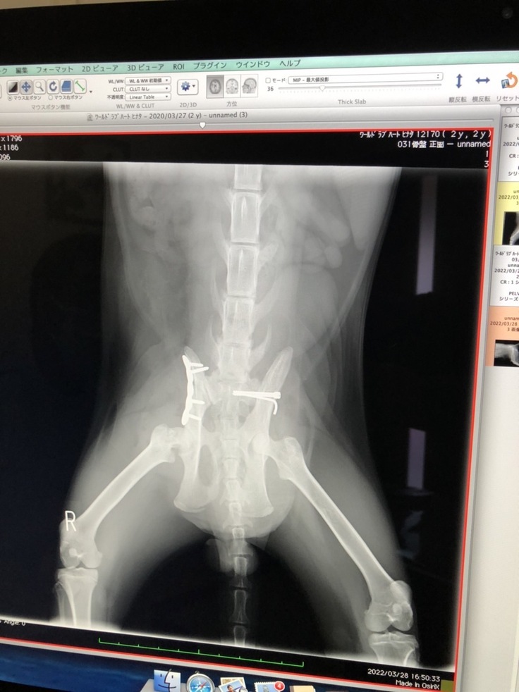 手術内容 ⑴骨盤骨折:右腸骨体骨折はプレート固定、左仙腸関節脱臼は元の場所に戻してスクリューで固定してもらいました。 ⑵右大腿骨頸部骨折:事故から2週間以上経っていて治ってきているのでこのまま自然治癒という形をとります。将来関節炎になる可能性があるとのこと。大変な手術でしたが、日向は頑張りました。病院でも看護師さんになつき、順調な回復を見せました。