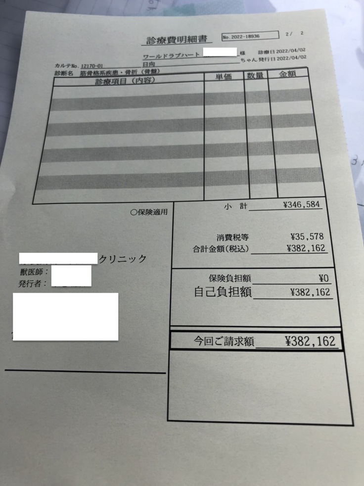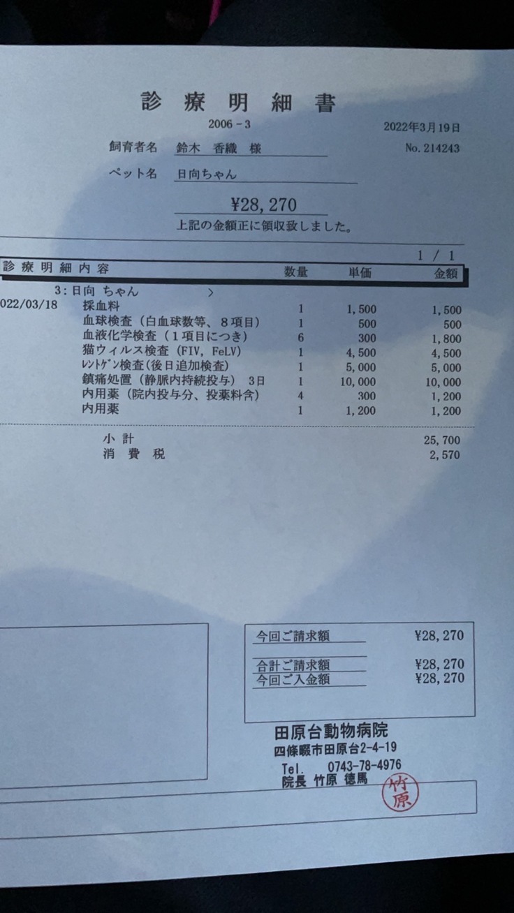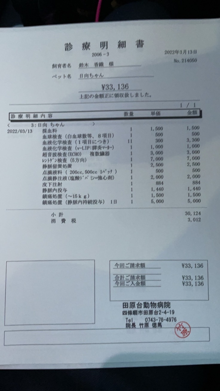 懸命にお世話をしておりますが、万が一、治療の途中で日向が亡くなってしまった場合、誠に勝手ながら返金は致しかねます。今までの治療費に充当させて下さい。