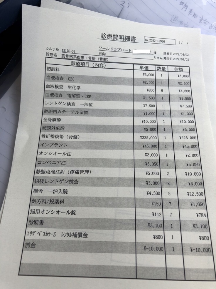 4/15に再度病院を受診し、抜糸、5/15頃に病院を受診し、レントゲンをとって骨がちゃんとくっついていれば治療終了となります。