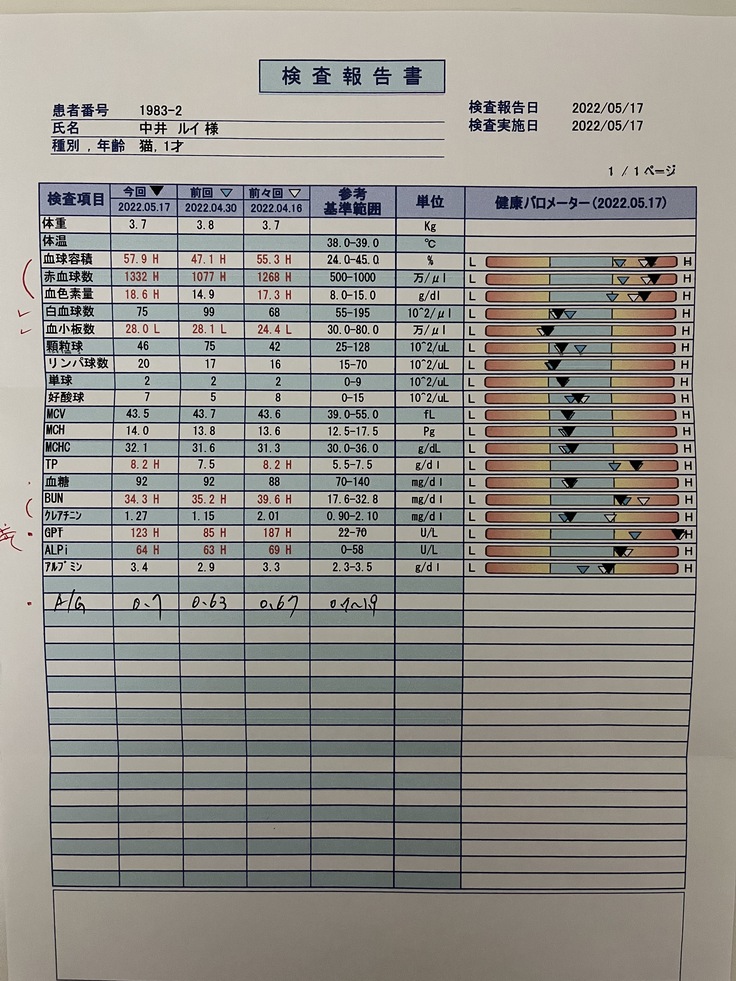 FIPの経過観察でも重要な項目ですが、0.7と基準値内で、前回の0.63よりも良くなっていました。