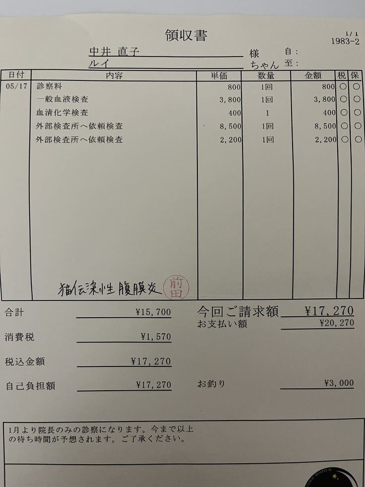 投薬中の後期という事もあり、投薬治療がどれくらいの効果が出たのか、一般血液検査だけでは分からない部分もあるため、予てより獣医の先生と2か月検査では「炎症マーカー」「FIPウイルス検査」の2項目を追加して検査をしよう、と申し合わせをしておりました。