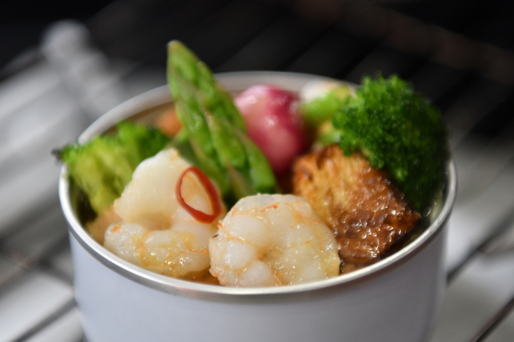 一押しはボイルしたお野菜や海老をツナ缶の上に載せて直接コンロに火をかける、特製アヒージョ!
