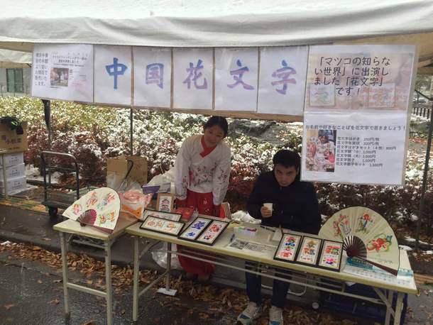今日は学園祭の初日です。民族衣装を着て「花文字」を販売しました。