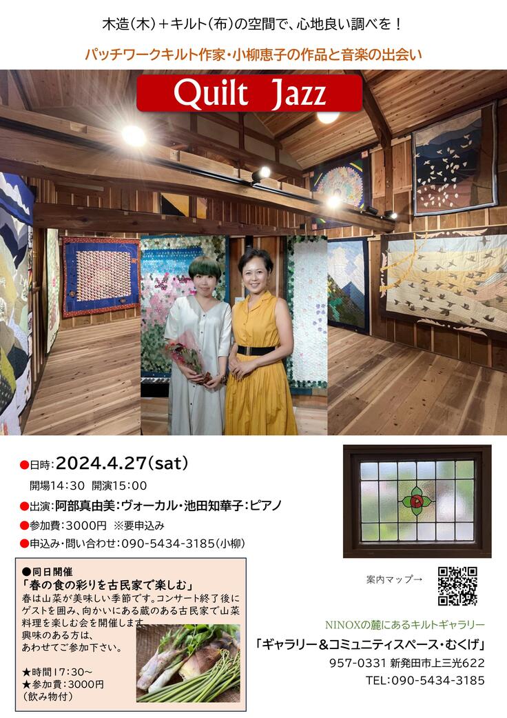 以来、パッチワークキルトと木造空間を月1でライブを開催しています。今年は3月30日(土)に、