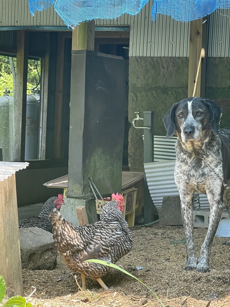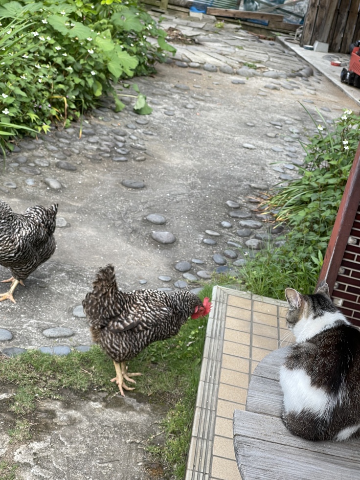 約3000坪の土地に、母家と妹の工房とスタジオと私の部屋での暮らしは広々、のびのび。高齢のあゆを見送ってから現在保護した犬猫鶏も可愛い家族です。