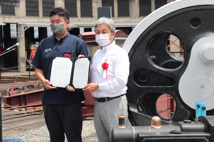 当日は森山理事長の挨拶にて県内外からの支援をいただき実現できたことへの感謝の気持ちとこの寄贈によりまなびの鉄道館と津山圏域がより盛り上がるようにと申し上げました。