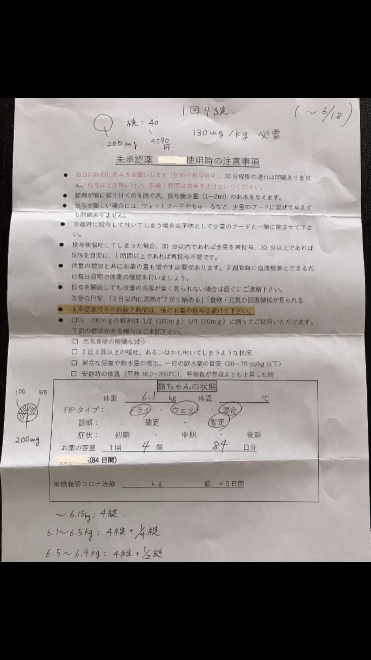 FIPの治療薬を84日間投与し、必要である検診を受け寛解を目指します。 支援金は全て薬代として使わせていただきます。