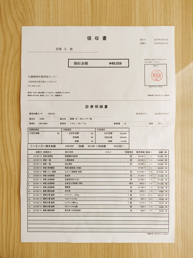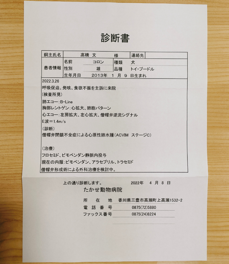 【3月26日】突然呼吸が苦しそうになり、病院で症状を説明するとすぐに酸素室に入ることになりました。心雑音がかなりあることが分かり、医師からはいつ急変するかわからないと伝えられすぐに検査をした結果、肺に水が溜まっており、肺水腫と診断されました。肺から水を抜かなければならなくなり入院することになりました。