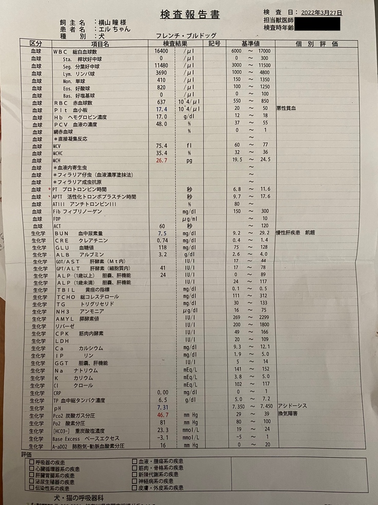 やはり、毎日の様に辛い状態で過ごしているエルに楽しく元気に遊んで欲しいと思い手術・検査をして健康になってほしいと思い決断しました。