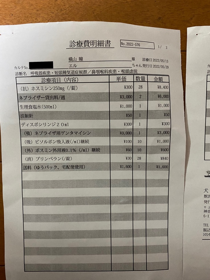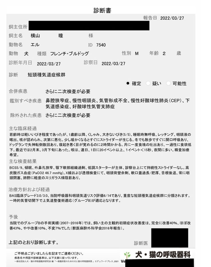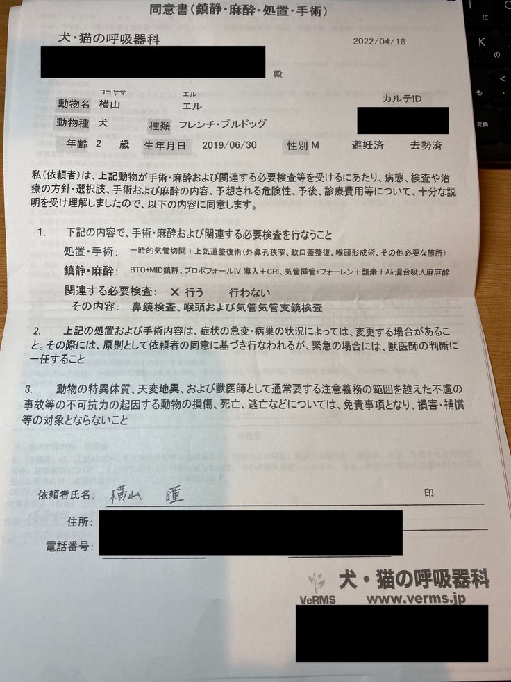 夜も、無呼吸症候群の症状が出ており、あまり眠れていないのではないかと不安になりました、体調も悪そうにしていた為、かかりつけの病院で相談した所、エルは鼻がほぼ塞がってるから麻酔するのはリスクが高い為、きちんとした専門病院で診てもらった方がいいと言われ、命に関わる事なのでこちらでは出来ないと拒否されました。紹介状を出して頂き、犬猫呼吸器病院を紹介して頂きました。