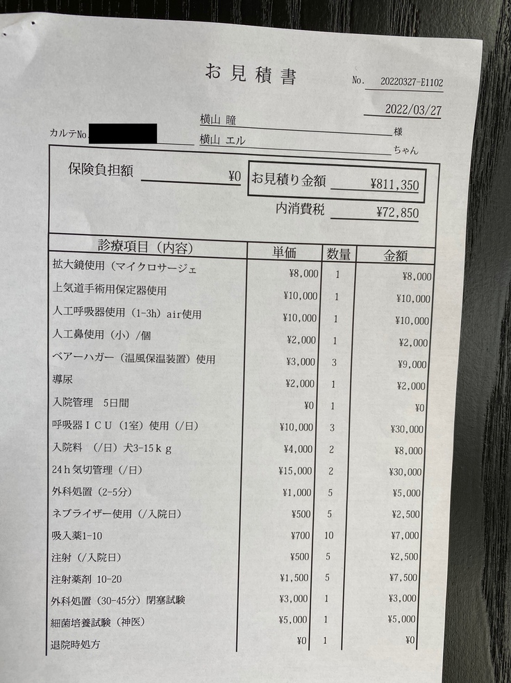 - 短頭種気道症候群の検査・及び手術・入院向けて、811,350円の手術費用がかかります、その他入院費用が加算されます。 手術は2022年4月18日月曜日に行います。 ご支援頂いたお金は、手術費用・入院費用に使わせて頂きます。