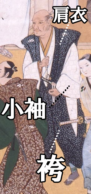 登場人物は武士が2人、片方の武士に仕えている人物1人の計3人です。武士2人は肩衣・袴を着ていて、小袖は全員が着ているという訳です。