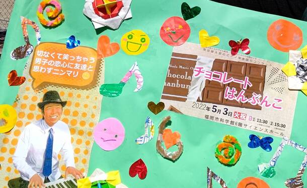 当日の会場ロビーを賑やかに飾ろうと、子どもたちと一緒に作成しました。音符やハートの折り紙で楽しさを表現しています。