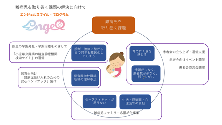 ■変更内容2025年8月から、ご支援いただく内容を、従来の患者団体の立ち上げ・継続運営支援を含む、難病のお子さんとその家族支援に関わる「エンジェルスマイル・プログラム」事業全般に拡大して、皆様から支援をお願いします。
