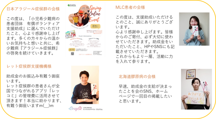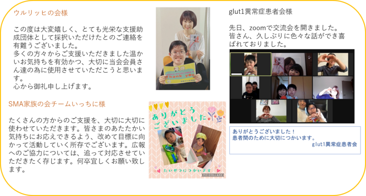 2022年1月に挑戦したクラウドファンディング【小児希少難病の子どもと家族のために、患者会の立ち上げ・継続支援へ】では、多くの皆様の温かいご支援をいただき、お蔭様で、17の患者会団体に、助成金を給付することができました。これをきっかけに、継続して「小児希少難病の患者団体支援事業」への寄付をお願いしてまいりました。