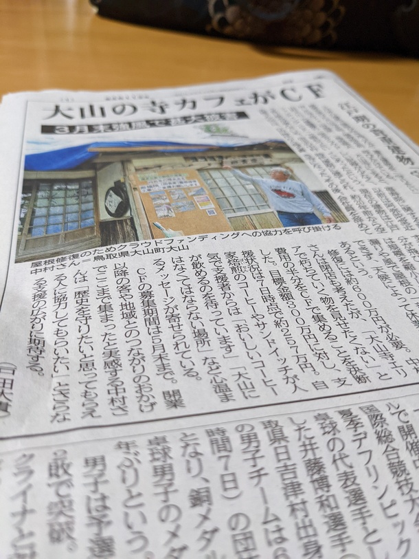 ネットからは「日本海新聞 大山の寺カフェがCF」で検索できます。