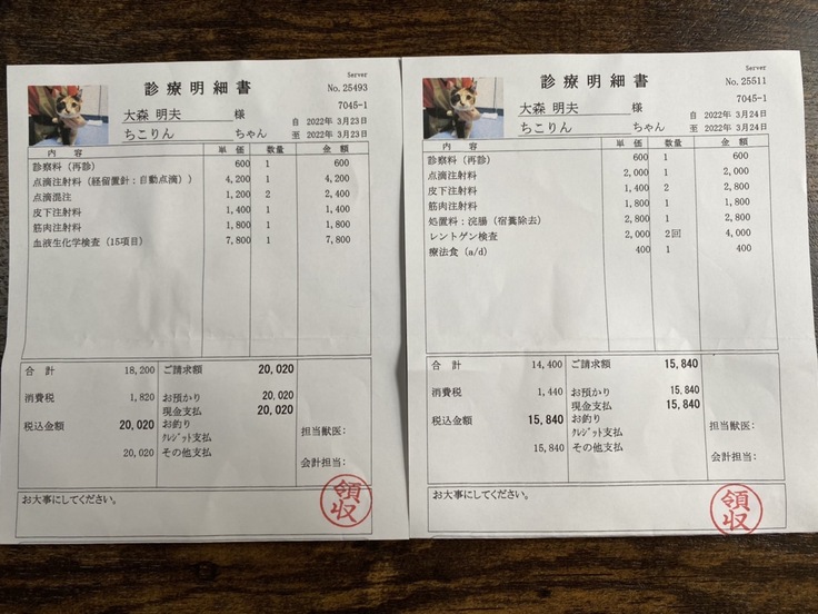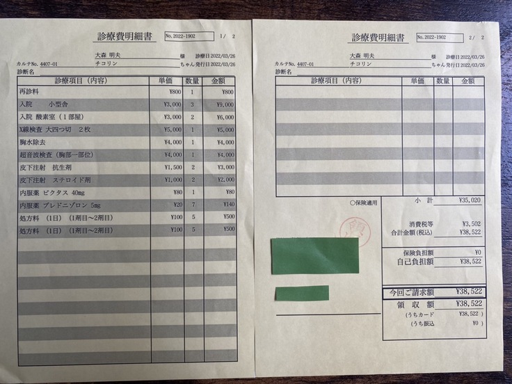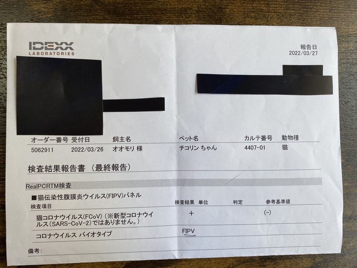 今年2022/3月中旬だんだんちこりんの食欲が減り小太郎を避ける様になり座っている時間が増えてきました。3月23日には食事は殆ど食べず病院へ連れて行ったところ猫風邪かもしれないとの事で、点滴注射をして頂いて帰ってきましたが、翌3月24日には呼吸が出来ないのか苦しそうにお腹を膨らませていて、既に夜なので慌ててお世話になっているもう一つの病院に連れて行ったところ、胸水が溜まって肺を圧迫し呼吸を妨げていました。血液検査や色々な処置して頂きFIPの可能性があると言われそのまま酸素室に三日間入院させ、そして3月28日に症状が少し落ち着いていた中PCR検査でコロナ陽性が確定しました。