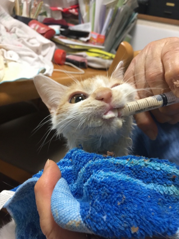 本日の夕方までボランティアが強制給餌をしておりましたが、現在はドライフードを自ら口にするまで回復しました。