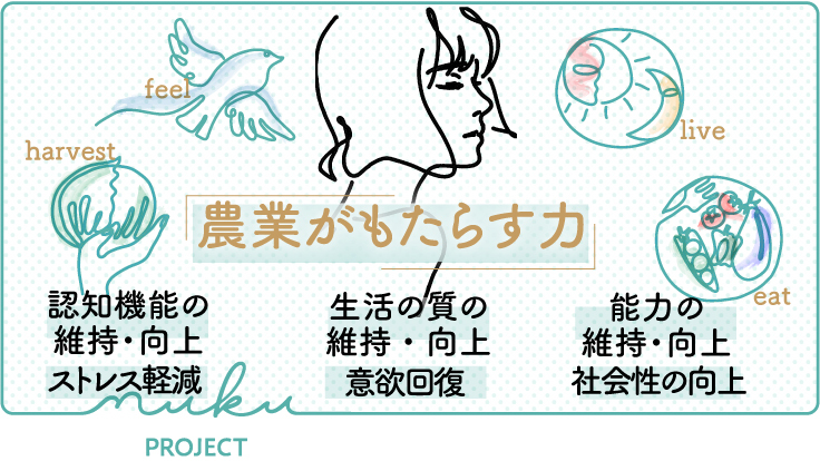 農業では、草花や野菜などの園芸植物や、身の回りにある自然とのかかわりを通して、感じる、(植物と)過ごす、育てる、採る、利用するなど、多くの人の興味をひき、楽しみながら精神や身体を刺激する要素、社会的健康を育むことができます。