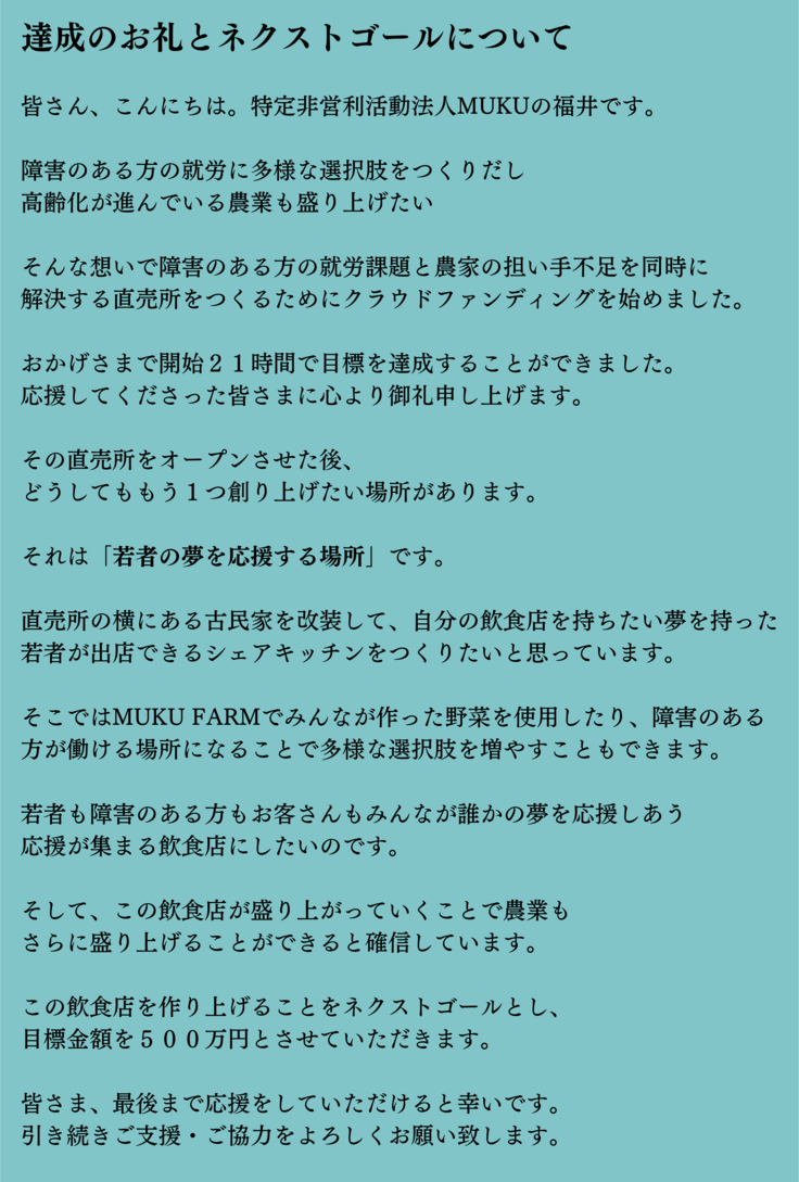 特定非営利活動法人MUKUが淡路島に野菜の直売所を改装する費用の一部と運営費が 資金の使途となります。 改装費(70万)オープンのための準備資金(18万)READYFOR掲載手数料(12万)