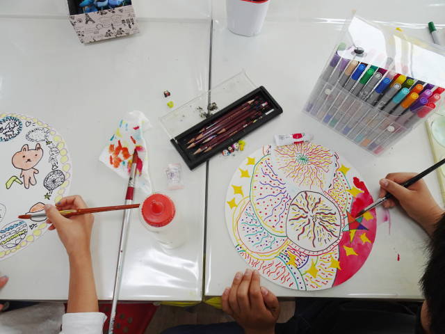 円形の画用紙に絵を描く。いつもと勝手が違い戸惑う。