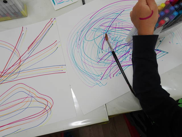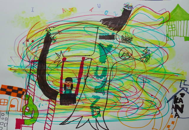 色鉛筆の線の上に自由に発想する。結構楽しい。
