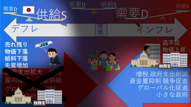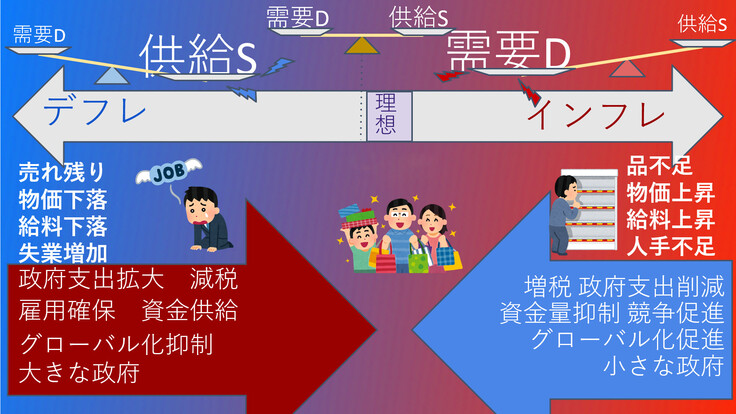 左のデフレに偏っているときには赤の矢印の中に書かれた政策がとられるべきです。