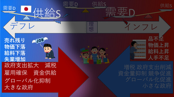 図で説明すると、上半分にある白の矢印が国の経済状況です。今の日本経済は長引く不況で左(デフレ)に大きく傾いています。