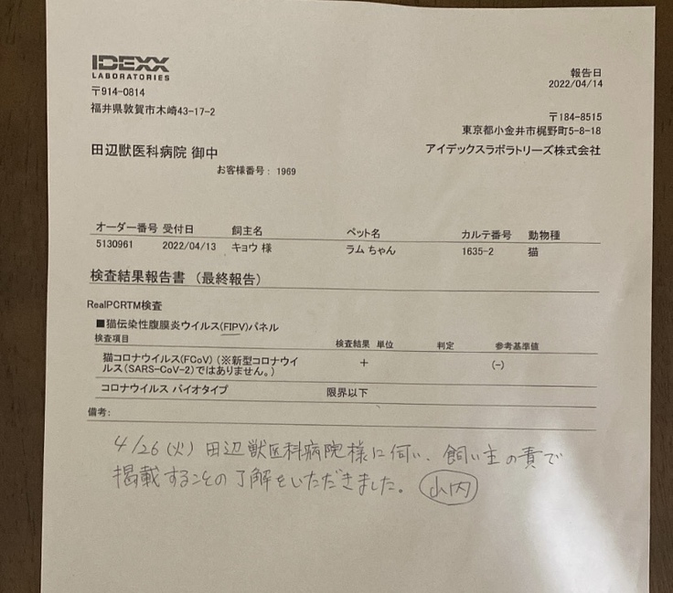4月11日 家に帰ると病院から帰ってきたラムちゃんがいました。結果を聞くと FIP かもしれないと。