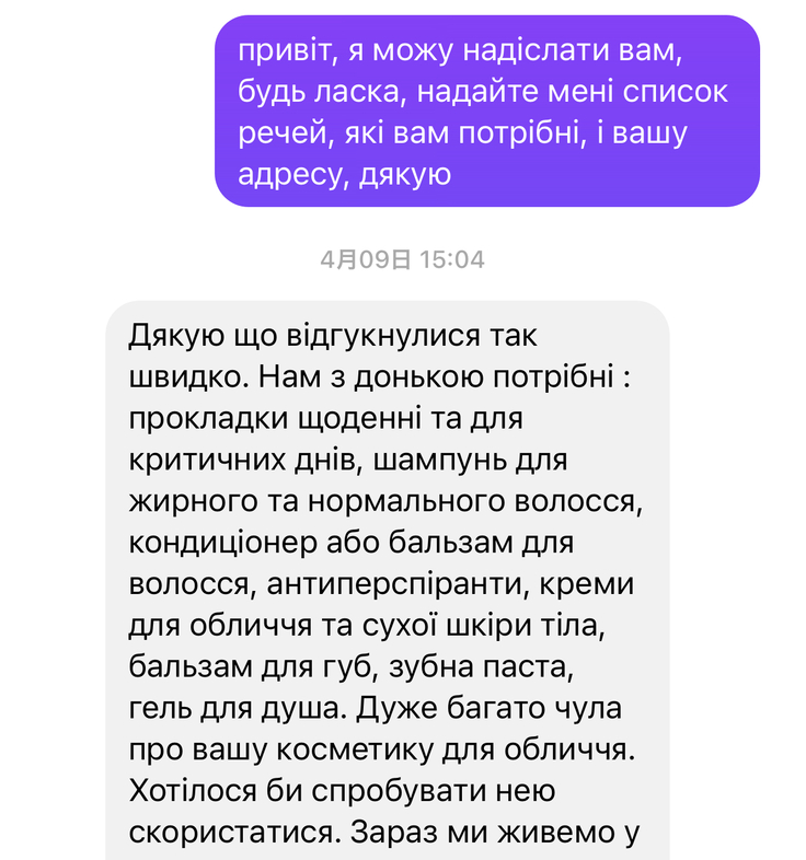 ※上記は生理用品やシャンプー、制汗剤、歯磨き粉、シャワージェル、化粧品を送ってほしいというワルシャワ在住のウクライナ人からのメッセージです。(ウクライナ語)