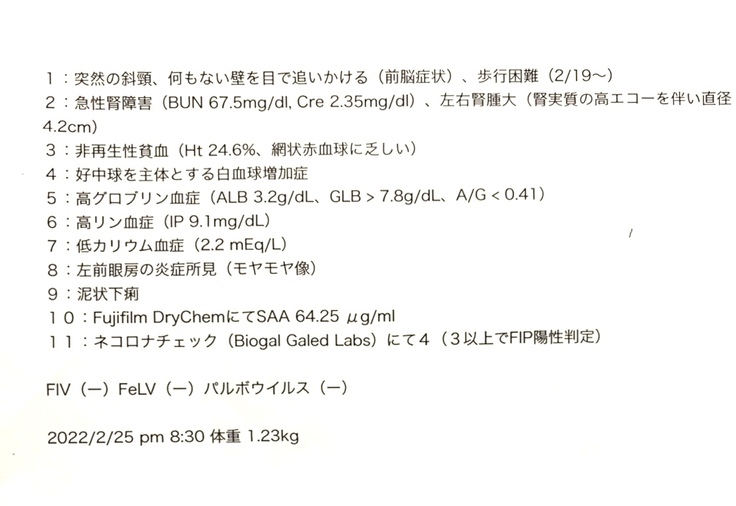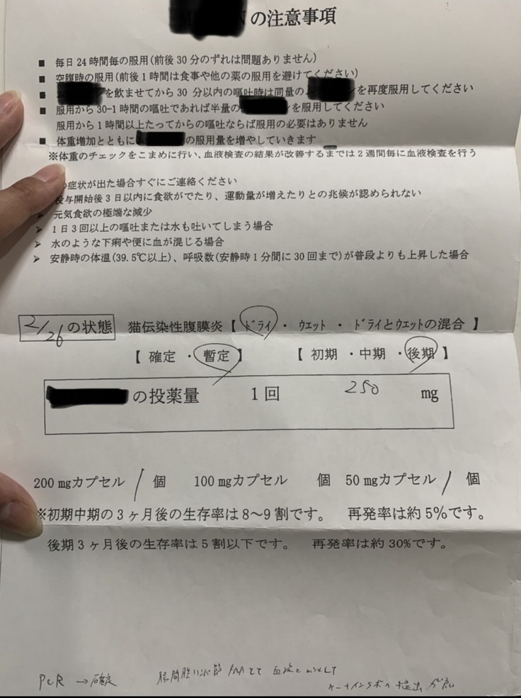 FIPが発覚するまでの4ヶ月に3つの病院にかかり、現在も投薬を処方して頂く病院と血液検査などをする入院していた病院の二つに通い