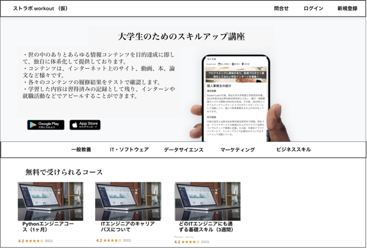 大学生の将来設計のための「学び」と「機会」を結びつけるサービスを検討中です。 世の中のありとあらゆる教育関連の情報を体系化し、ユーザーの興味・関心、適性に合ったスキルルートを作成・提供します。 獲得した知識をアピールすることにより、インターンや就活に繋げ、将来のキャリア形成をサポートします。 ※スキルルートとは、我々が独自で作成したスキル獲得までの学習リソースのプレイリストです。 組織のVision、Missionは以下の通りです。 <Vision> ・人の好奇心が未来を切り拓く、そんな社会を。 <Mission> ・世の中のありとあらゆる情報を体系化し、新たな価値を生み出す。