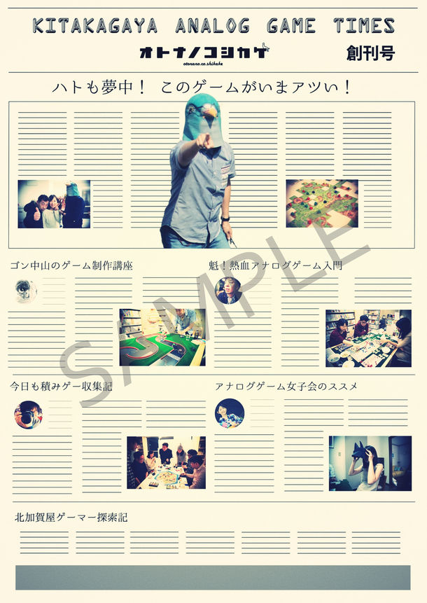 仕事で忙殺されているサラリーマンたちに、もっと楽しい週末を過ごすヒントを!われわれの活動内容と北加賀屋の魅力をWEBや機関誌等で発信していきます。読者から挑戦してほしいゲームをリクエストしてもらってチャレンジしたり、ゴン中山のゲーム制作講座、アナログゲーム女子会の薦め、北加賀屋ゲーマー探索記など、特集を組んで楽しい紙面にする予定です。
