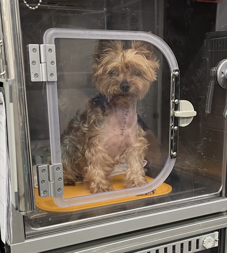 その後、5月4日に緊急手術となりました。手術中に気管虚脱以外に2箇所問題がある事が発覚し、2度危険な状態になりましたが、先生の根気強く懸命な処置によって、11時間の手術の末、声を失いましたが5月14日に退院する事が出来ました。