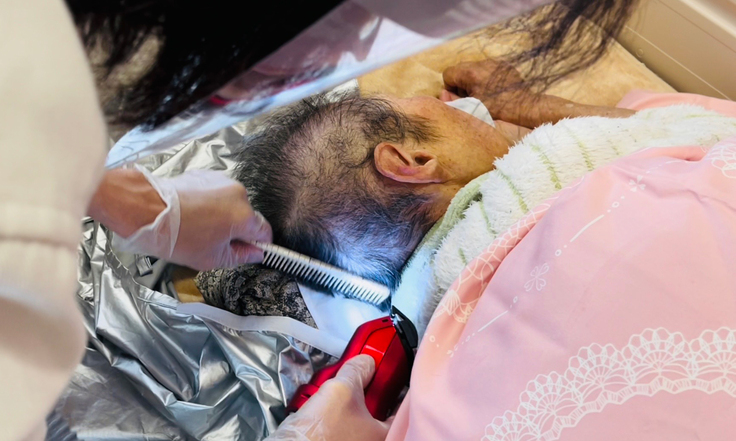 以前は髪が散らばらないようにベッドの周りにカットクロスをしっかりと養生して、介護士さんから補助してもらいながらカット。ご利用者様が意図せず動いてしまう時もあるので、ケガをさせないように気をつけながら切っていて、準備から後片付けまで30分ほどかかっていました。