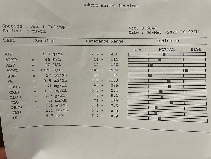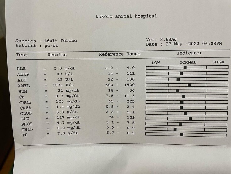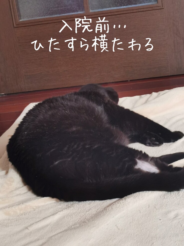 1週間が過ぎたあたりで、寝込むようになってしまい開腹手術の疲労等、身体への負担が大きいのだと思っていました。寝ている体制も悪くなり、冷たい床を好むようになり、呼吸も少しおかしいので病院へ再び連れて行くと、36度台の低体温になっており大変危険な状態と言われました。