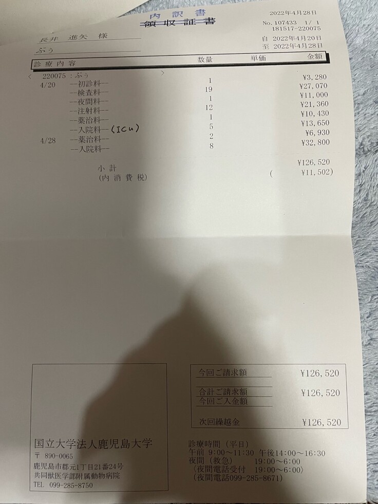 ※医療明細・診断書に関しては動物病院の許可を得ての掲載になっています。