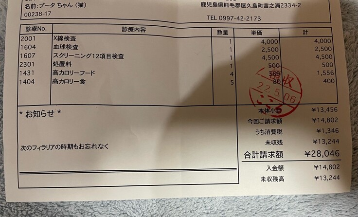 今回の検査で腫瘍が確認できなかったので先生も正確な位置が分からないとの事で、エコー・レントゲン料金は診察料金には入れなくて大丈夫との事で上記の請求となっています。