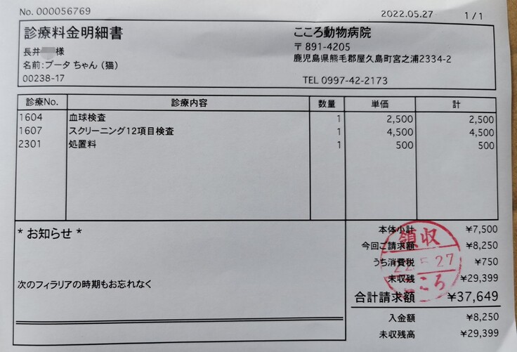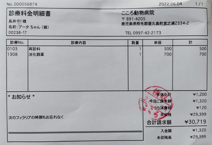 ※動物病院の飼い主登録名が兄の名前で登録になっている為、そちらは非表示させて頂いています。