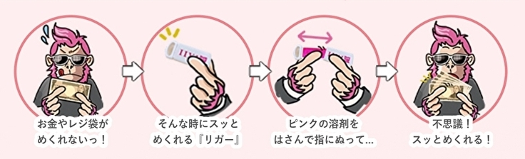 すぐに出して使える紙めくりグッズです。指につけると、ビニール袋や紙がスッとめくれます。「スッとめくれる"リガー"」が普及すれば、指舐めする人がいなくなると信じています。