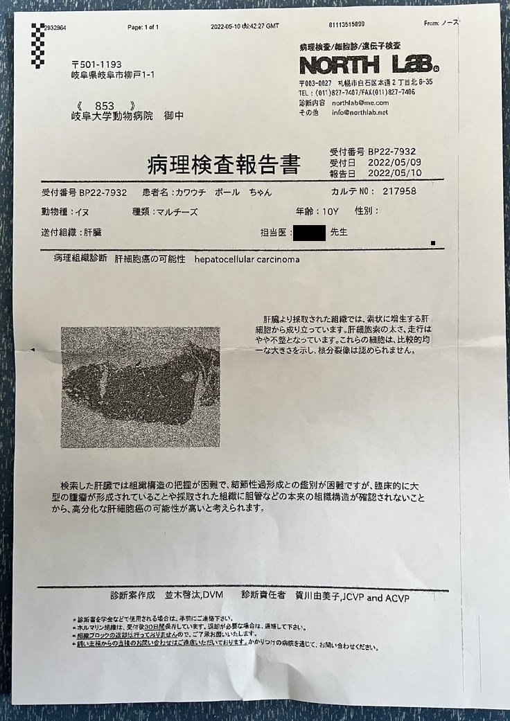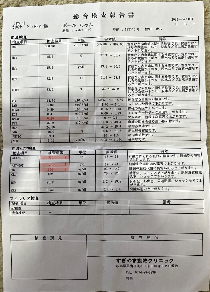 我が子ポールの肝臓に7cmの癌が発覚しました。 いつもより元気が無く体調不良の為、かかりつけの先生にもてもらったら肝臓に大きな塊がありました。 肝細胞癌の可能性がありますと言われました。