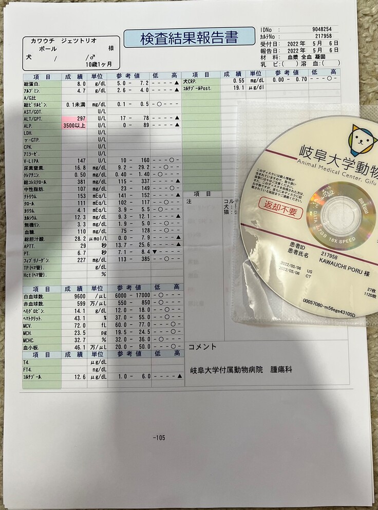 大学病院での血液検査 ALP:通常が89〜の所ポールはなんと3500以上 びっくりです。