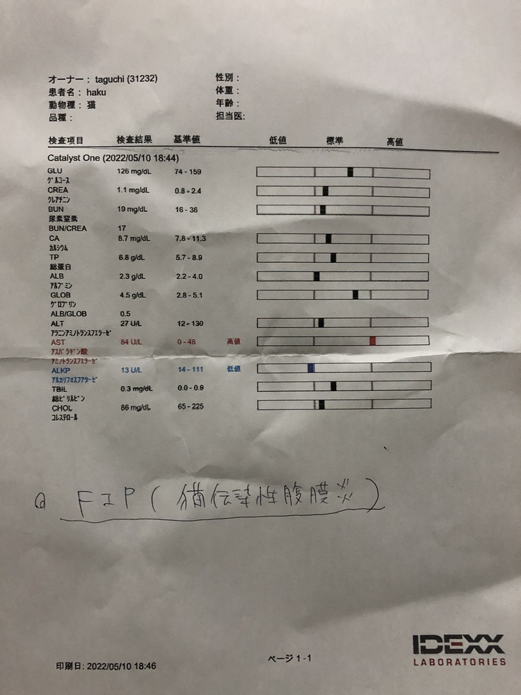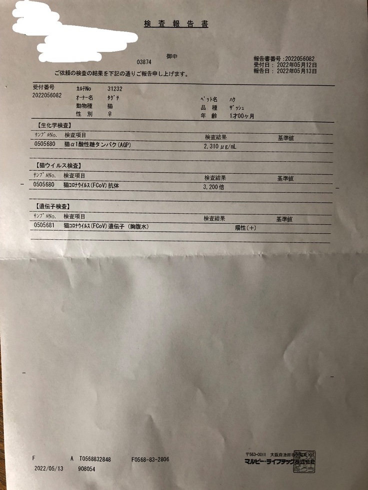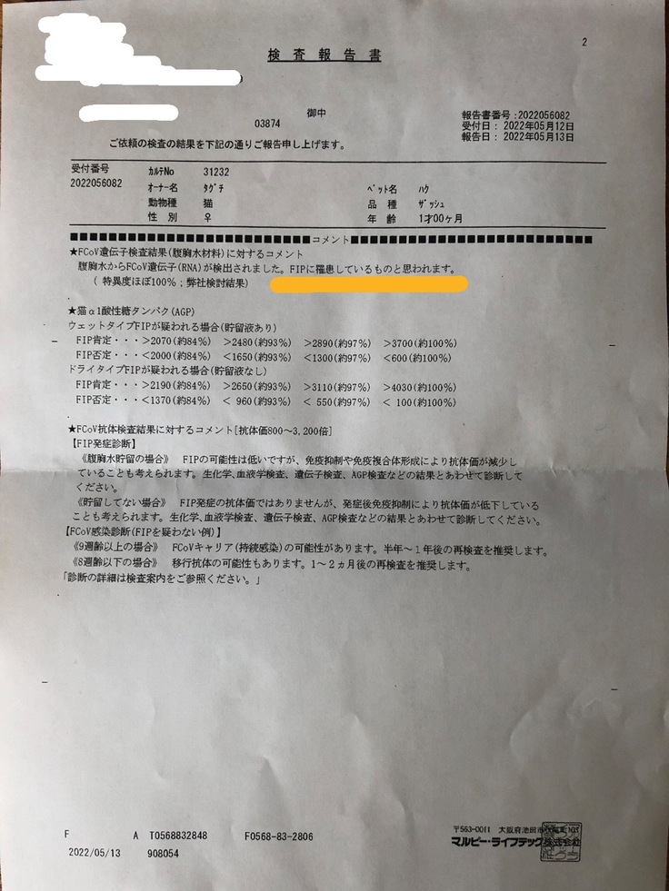 そして数日後、検査結果はやはり、FIPで間違いはありませんでした。