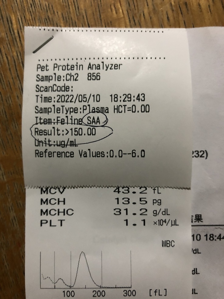 SAAというFIP発症と深く関わる数値も、通常は0.0~6.0のところ、150という非常に高い数値でした。