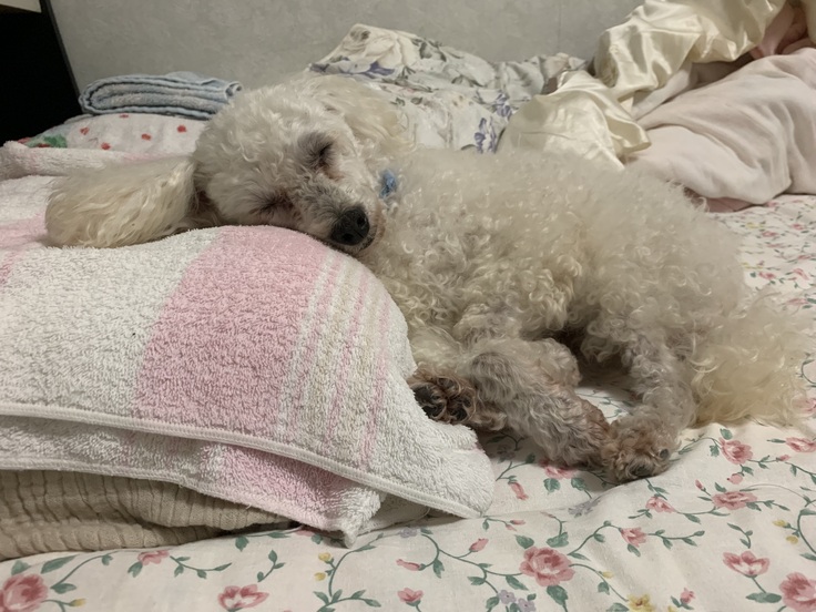 最近は、すぐに疲れるせいか寝てばかりになってしまい、大好きだった散歩にもほとんどいけず、ただただ安静に過ごすため、お家からほとんど出られない状態です。